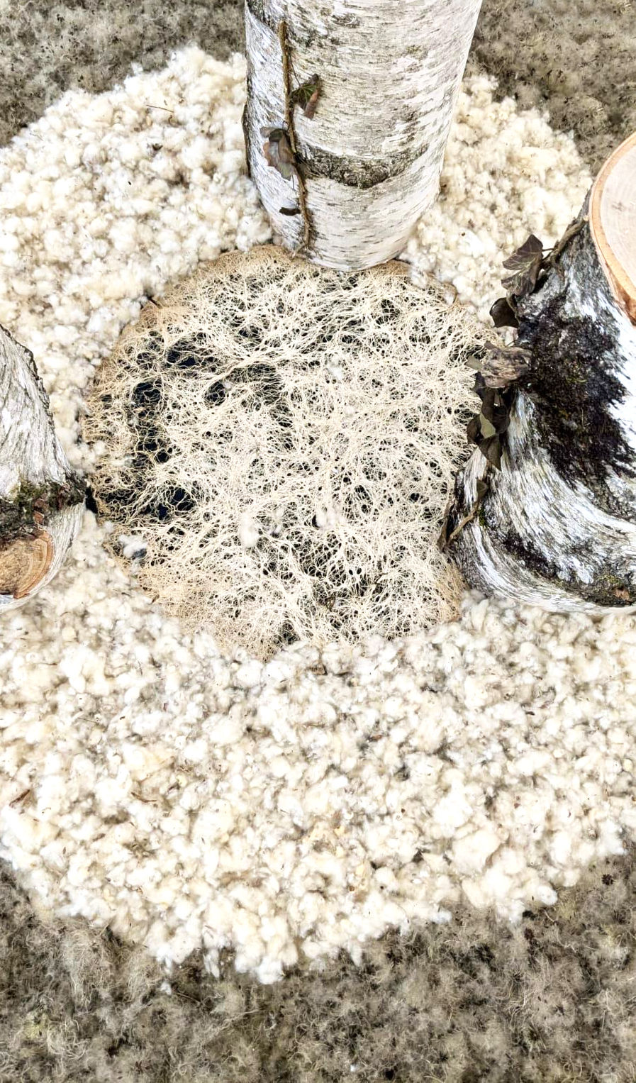 LE SOUFFLE DU VENT, BÉTULA ET L'ENVOL DES GRAINES. 2025 Photographie détail des 3 bâtons de bouleaux ornés de racines, mousse, feuilles d'or. Au sol fleurs de clématites sauvages, coton de peuplier, racines. Diamètre cercle : 123 cm; hauteur 2.50 m hors socle.